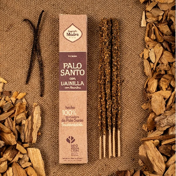 Madera de palo santo (peruano), aceite esencial de vainilla, carbón vegetal, biomasa de frutas, aglutinante natural y sal.