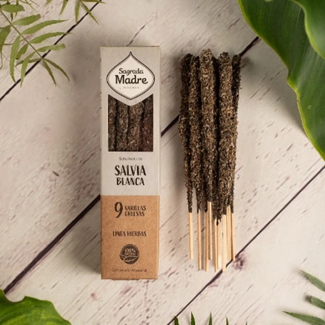 Hojas de Salvia blanca, frankincense, copal, biomasa de frutas, carbón vegetal y aglutinante a base de plantas.